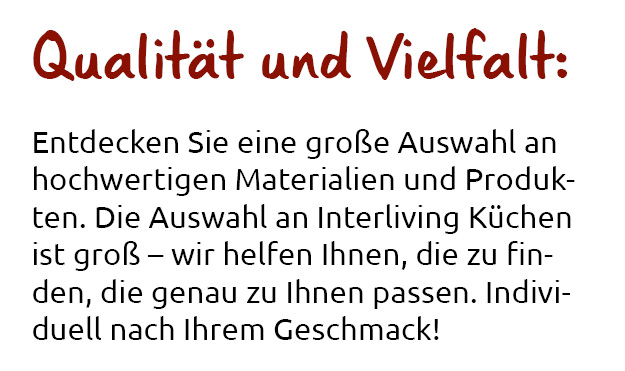 Eine Küche im Landhausstil wie die Interliving Küche Serie 3063 oder lieber eine moderne, grifflosen Küche mit Fronten in Betonoptik - Serie 3033? Oder geradlinig und klar designt, wie die Interliving Küche 3057, mit edlen, grifflosen Fronten in puristischem Schwarz softmatt? Bei Ihrem Interliving Händler finden Sie ihre individuelle Küche.